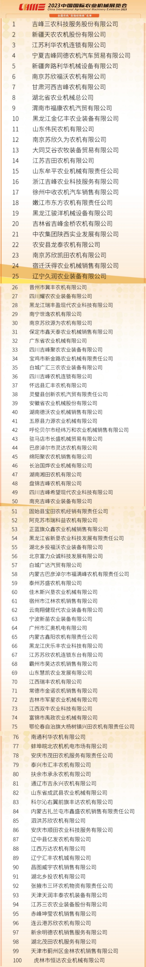 日前,由中國農業機械流通協會《農機市場》雜志社面向行業開展的全國農機“百強經銷商”評選活動,評選標準以企業經營能力、服務能力、社會信用三個方面的綜合能力為依據,經過申報初篩、網絡投票及專家打分三個環節為期兩個月的層層挑選,最終從報名的300余家農機經銷企業中評選出100家經銷企業。10月27日,在2023中國國際農業機械展覽會期間舉辦的2023中國農機市場發展論壇上,全國農機“百強經銷商”評選結果正式公布。吉峰三農科技服務股份有限公司、新疆天農農機股份有限公司等正式入圍百強名單。
